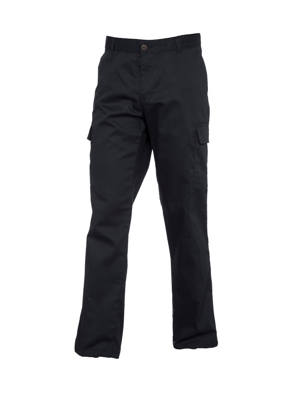 65% Polyester 35% Cotton Fabric: 245 GSM/7 oz Single belt loops reinforced for extra strength Metal Button at waist 2 side & 2 rear pockets with velcro flaps 2 thigh pockets with velcro flaps Flat front Wide belt loops